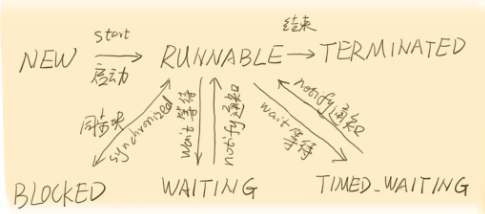 NEW状态表示刚刚创建的线程,这种线程还没开始执行。等到线程的start()方法调用时,才表示线程开始执行。当线程执行时,处于RUNNABLE状态,表示线程所需的一切资源都已经准备好了。如果线程在执行过程中遇到了synchronized同步块,就会进入BLOCKED阻塞状态,这时线程就会暂停执行,直到获得请求的锁。WAITING和TIMED_WAITING都表示等待状态,它们的区别是WAITING会进入一个无时间限制的等待,TIMED_WAITING会进行一个有时限的等待。那么等待的线程究竟在等什么呢?一般来说,WAITING的线程正是在等待一些特殊的事件。比如,通过wait()方法等待的线程在等待notify()方法,而通过join()方法等待的线程则会等待目标线程的终止。一旦等到了期望的事件,线程就会再次执行,进入RUNNABLE状态。当线程执行完毕后,则进入TERMINATED状态,表示结束。