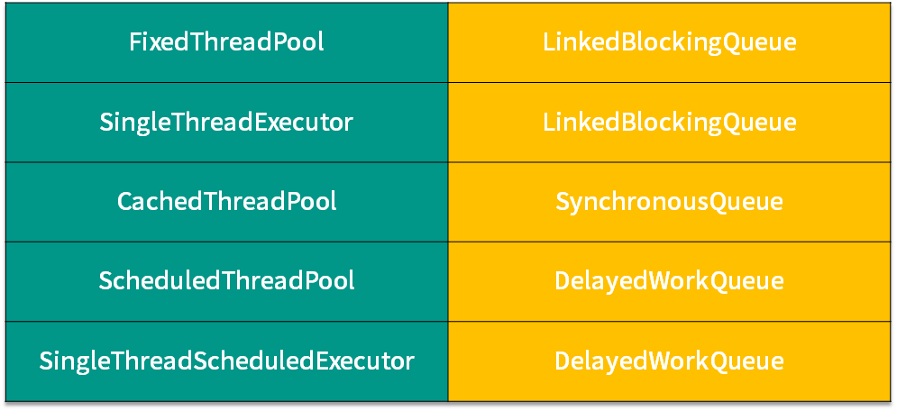 表格左侧是线程池,右侧为它们对应的阻塞队列,你可以看到 5 种线程池对应了 3 种阻塞队列,我们接下来对它们进行逐一的介绍。